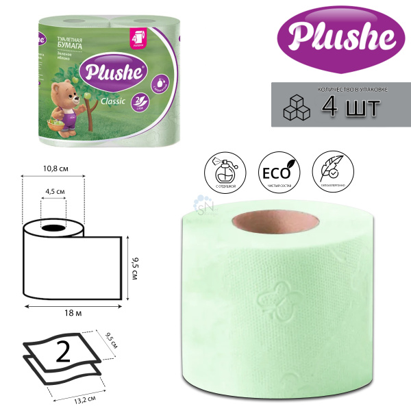 Бумага туалетная 4 рулона 2-слойная Plushe Classic Яблоко 2097 зеленая
