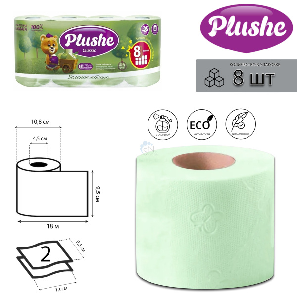 Бумага туалетная 8 рулонов 2-х слойная Plushe Classic Зеленое яблоко 9906