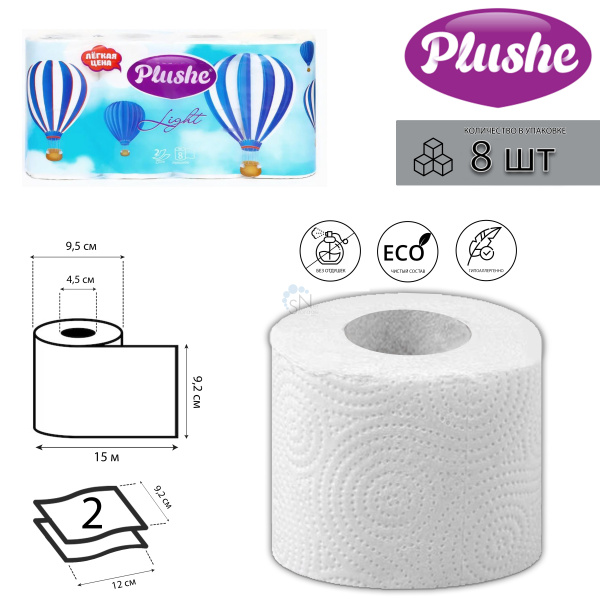 Бумага туалетная 8 рулонов 2-х слойная Plushe Light Color 5120 белая