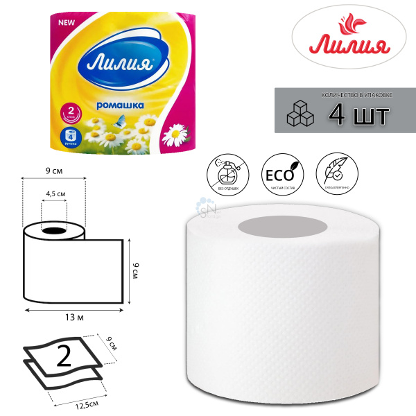 Бумага туалетная 4 рулона 2-х слойная Лилия Яблоко/Ромашка 5628/5635