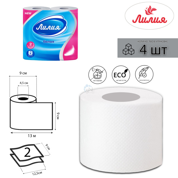 Бумага туалетная 4 рулона 2-х слойная Лилия 9697/5604 белая