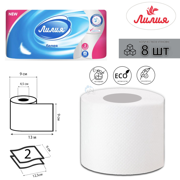 Бумага туалетная 8 рулонов 2-х слойная Лилия 9949/5612 белая
