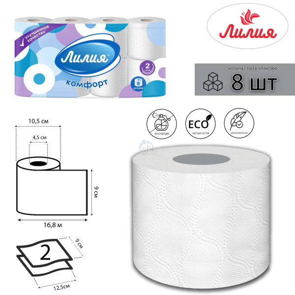 Бумага туалетная 8 рулонов 2-х слойная Лилия Комфорт 0186 белая