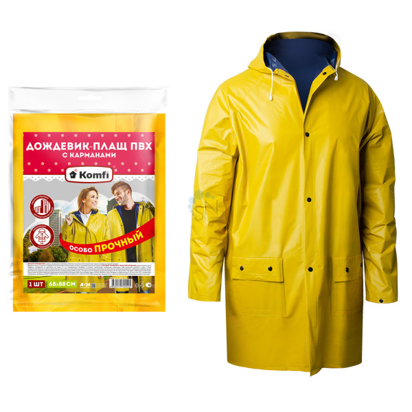 Дождевик-плащ на кнопках с капюшоном 68*88 см сверхпрочный двухслойный ПВХ 150 мкм Komfi EVA01GO желтый