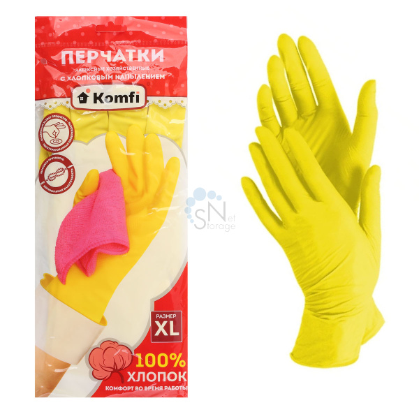 товары для школы и офиса Перчатки латексные 1 пара (2 шт) размер ХL с х/б напылением Komfi 3048 желтые
